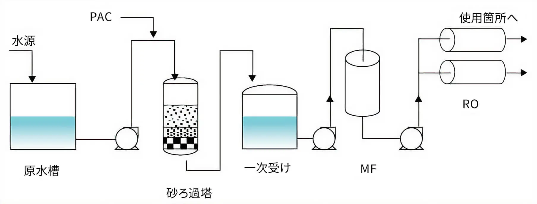 水道水や河川水、または生産工程のリサイクル水から工業用水を製造する設備です。膜処理やイオン交換樹脂等、原水の水質にあわせたプロセスを組み合わせ、お客様のニーズに合った水質の水を供給します。一例として市水の代わりに河川水や地下水を使用することにより、より安く工業用水を得ることができます。